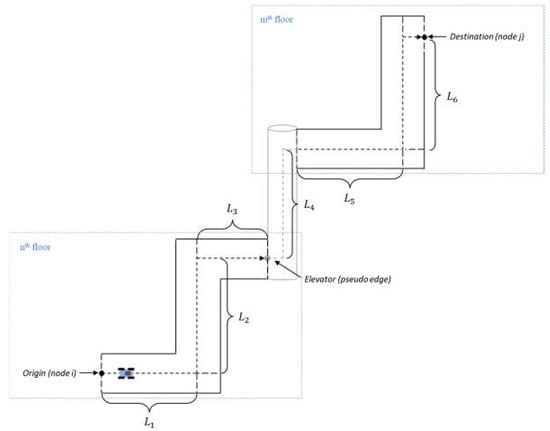 As a result, , i.e., the travel time between any two nodes and within the building, can be calculated by summing the results obtained with Equations (1) and (4). Note that Equation (4) is only needed when two nodes are located on different floors.
