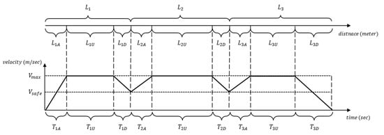 To explain how the travel time is estimated in this research, certain situations were assumed. Figure 1 shows the example of indoor robot movement from origin to destination in a multi-story building. First, let us assume the robot only moves on a single floor ( floor) to explain the calculation procedure for the horizontal movement. There are two corners between the starting node and the destination node, the elevator. Then, we can divide the robot’s path into , , and based on the two corners. Figure 2 shows a graph of the robot’s moving speed and travel time at that moment. The three sections we divided are further divided into three parts again (acceleration (), constant (), and deceleration (), respectively) to follow the above assumptions applied for the horizontal movement segment.