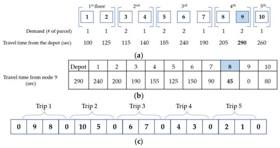 Along with the development of relevant robot technology, academia has shown interest in last-mile delivery using robots for the past couple of years [11]. Most related research utilized the existing vehicle routing problem (VRP) to adopt robots in outdoor environments [12,13,14,15,16,17]. Last-mile delivery problems have been solved with various VRP formulations via mixed integer linear programming (MILP), and efficient algorithms have been developed to address larger problems due to the inherent complexity of the VRP. Of course, it might occur that the outdoor environment remains a more general solution for delivery services because technical difficulties are encountered indoors where the global positioning system (GPS) is inoperable [18].