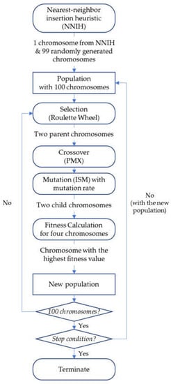 The crossover operator reproduces child chromosomes. However, a conventional n-point crossover is not suitable to generate child chromosomes in our case because every node must be visited once in the route plan. Therefore, the PMX operator was chosen as the crossover operator [29]. After choosing two random cut points on the parent chromosomes, the segment between the cut points was exchanged. One arbitrary point was generated for each parent and employed to establish a segment. This is called the mapping section. Then, the remaining parts with no conflicts (i.e., exhibiting no shared nodes) were maintained at their position. However, if a conflict occurs (i.e., the same node applies), the gene from the mapping section fills the position. The crossover operator created two new child chromosomes from the two parent chromosomes. Details on the PMX operator can be found in [29].