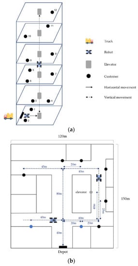 Once the travel time required for horizontal movement is calculated with Equation (1), the vertical movement segment () of the robot should be considered because most buildings in cities are multistory buildings. Usually, robots can move between different floors by taking the elevator, as shown in Figure 1.