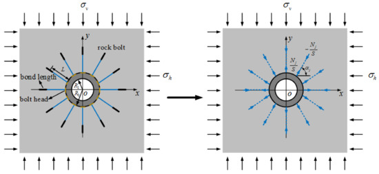 Based on the simplified bolts model, one of the concentrated forces acts outwards at the boundary of the tunnel, and the other acts inwards at the midpoint of the bond length (see Figure 1). Let Nj denote the axial force of the j-th rock bolt. Then, we have the following equations: