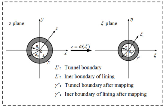 Firstly, the conformal transformation is adapted to map the lining and the outer area of the tunnel into a concentric circle and the outer area of a unit circle, respectively. See Figure 2. Moreover, the mapping function is as follows: