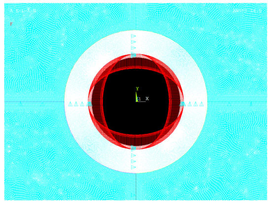 The numerical solution was calculated with ANSYS. The size of the model was , the lining and rock mass were simulated using the Plane42 element (2D entity unit) with different material properties, as shown in Table 1, the point-anchored rock bolts were simulated using the Combin14 element (spring unit), and the contact relationship between the lining and the surrounding was simulated using the targe169 and contac171 elements, which is able to set different contact relationships through options such as complete contact. The boundary condition was to limit the displacement of the symmetry axis of the model in the x and y directions, respectively. The process of tunnel excavation was simulated through the “stress release method” proposed by Duncan and Dunlop [37]. In addition, Hooke’s law was adopted as the constitutive model in this paper. Figure 3 shows the numerical model. Figure 4, Figure 5 and Figure 6 show a comparison of the analytical and numerical solutions, including the axial forces of bolts, tangential stresses, and radial displacements of points at the inner boundary of the lining. λ = σv/σh is the coefficient of lateral pressure. The compressive stress and the displacement toward to hole were positive.