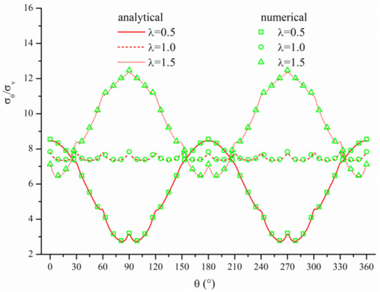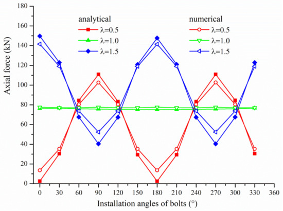 It can be seen from the Figure 4 that the axial force distribution of the bolts obtained by the proposed method was in line with the actual laws, i.e., the maximum axial force was reached when the bolt was installed along the direction of the maximum in situ stress because of maximum deformation and the axial forces of the bolts were the same at different angles when λ = 1. As compared with the numerical solution, there were only marginal differences along the direction of minimum in situ stress when λ = 0.5 and λ = 1.5, and the numerical solution was larger. In addition, they were almost equal when λ = 1, and only at certain angles was the numerical solution slightly larger. As for the tangential stress and the radial displacement of the point at the inner boundary of the lining, as shown in Figure 5 and Figure 6, the analytical solution almost coincided with the numerical solution. Therefore, to a large extent, the effectiveness of this model is proved.