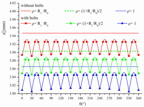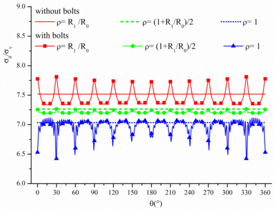 In Figure 7, the three lines are the tangential stresses of the points within the lining without bolts, while the three lines with symbols are the tangential stresses with bolts. This shows that the stress distribution in the lining changed and was not uniform because of the bolts, i.e., for most of the points at the inner boundary of the lining, their tangential stresses were reduced by about 2.23% compared with the without bolts scenario; however, for the points within 4° from the bolts, their tangential stresses increased rapidly, even exceeding the value without bolts, and the maximum amplitude reached 3.72%. Conversely, the law was opposite for the points at the outer boundary of the lining, i.e., the tangential stresses in the direction of the bolts sharply decreased, and the maximum amplitude reached 8.68%. In addition, for the point in the middle of the lining, the tangential stresses were slightly smaller than in the scenario without bolts, but increased in the direction of the bolts, with a small amplitude. As for the radial displacement comparison in Figure 8, it can be seen that, at any point on the inner, the middle, or the outer boundary of the lining, the radial displacements decreased, especially in the direction of bolt installation.