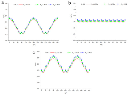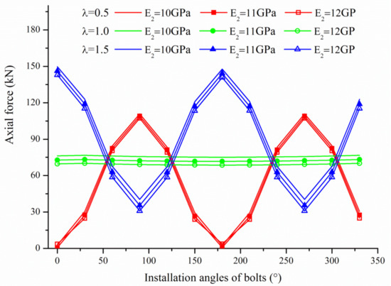 It can be seen from the Figure 9 that regardless of the value of λ, the axial forces of the bolts dropped with the increase in the Young’s modulus of the lining E2. This law is the same with the radial displacement for the points at the inner boundary of the lining with different E2 in Figure 10. While the tangential stresses were different, they increased with the increase in E2, as shown in Figure 11. These results are consistent with the engineering reality.