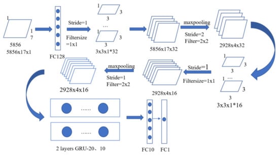 According to the characteristics of traffic volume extraction by a convolutional neural network, this paper intends to set up two convolutional layers. The convolution kernel size is 1 × 1, the step size is 1, the number of convolution kernels is 32 and 16, respectively, and the number of pooling layers is 2. The maximum pooling is used. The activation function is the rule function. For the gated circulation unit layer, a GRU is applied for extracting the traffic volume time characteristics. The GRU sets up 2 layers with 20 and 10 neurons in each layer, the time step is taken as 8, and 8 historical data are used to predict the next moment’s traffic volume.The specific data flow is shown in Figure 4.