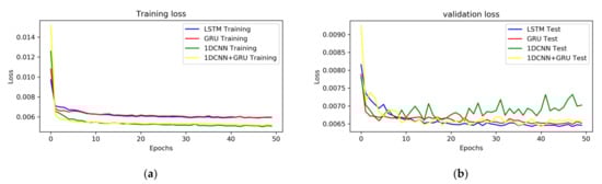 The samples are fed into the LSTM, GRU, 1DCNN, and 1DCNN plus GRU models for training. The loss functions of the training and validation sets are obtained by training, as shown in Figure 5, where (a) shows that the loss function of the training set of each model gradually decreases and eventually stabilizes with the increase in the number of iterations. The loss function of the validation set in (b) gradually decreases with the increasing number of iterations. Although all fluctuate, the 1DCNN model fluctuates the most. Thus, it can be concluded that the 1DCNN model applied to the data of this thesis has a large error.