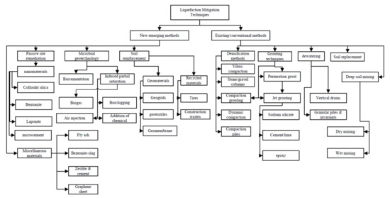 The quest for sustainable, economic, environment-friendly, and effective means of mitigating earthquake-induced liquefaction necessitates the need to conduct more research/studies on composite or mixed soils, which are most likely encountered in fields. The common conventional liquefaction-mitigation methods work with the principles of densification, solidification, improvement of soil engineering properties, soil reinforcements, soil replacement, and drainage improvement-based techniques for water repellence [5,6]. Conventional and emerging soil liquefaction-mitigation methods are effective but are mostly associated with one or more limitations. Such limitations include poor cost feasibility associated with larger projects, negative environmental impacts/non-sustainable (due to introducing chemical agents), and disturbance to ancillary structures that are sensitive to deformation and vibrations, due to waves and disruptive installation effects [5,7,8,9,10]. More recently, [11] presented a review of the existing liquefaction mitigation methods and highlighted some limitations associated with them, indicating their effectiveness, applicability, duration time, durability, cost, and long-term observation. A tree diagram (infographic), broadly classifying the existing liquefaction mitigation methods, is summarized in Figure 1. The textbook soils referred to as clean sands and pure clays are well-researched, while in reality, in-situ soils are mainly composed of both cohesionless and cohesive particles. This necessitates the need to shift the research focus onto mixed soils for possible soil replacement alternatives/choices in small to medium-scale projects.