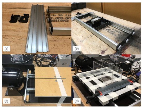 The sliding mechanism assembly for the shaking table. (a) Main parts of the sliding mechanism. (b) The sliding mechanism assembly. (c) The table and actuator assembly. (d) The adjustments and calibration of the shaking table.