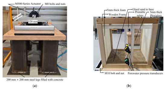 The shaking table setup and main components. (a) The shaking table assembly. (b) The designed and fabricated soil rigid box/container.