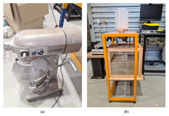 The most tasking part of the model preparation procedures is shown in Figure 6. As per the preliminary sample preparations, the clean sand (ECS) and the industrial kaolinite were oven-dried between 50 and 70 °C for 24 h. Dry mixing by utilizing the mechanical mixer, as shown in Figure 6a, produced the mixed samples derived from both ECS and sand-kaolinite sand matrix mixtures. For all the studied soil samples, dried specimens were pluviated into the soil container using a manual pluviator, as shown in Figure 6b. Pluviated samples were then saturated with de-aired water from the side of the model and left to equilibrate for a minimum time of 72 h [14]. The de-aired water with 72 h resting time was used to ensure saturation, since it is impractical to carry out a B-value check to confirm the degree of saturation for the soil specimen. The soil specimens were covered by plastic wrap during this time to prevent the evaporation and further aeration of the de-aired water.