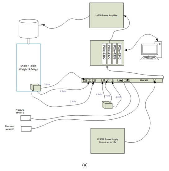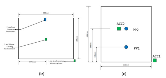 The utilized national instruments chassis is the model PXIe-1078 coupled with suitable VI data cards and other hardware, as schematically shown in Figure 7a; the plan and longitudinal view of the test instrumentation are shown in Figure 7b,c, respectively. The applied instrumentation includes accelerometers of model 4030-series, manufactured by TE Connectivity (TE.com/sensorsolutions accessed on 20 July 2022), and flush pressure sensors of SS402 series, manufactured by Sendo-Sensor (sendo-sensor.com accessed on 20 July 2022). An accelerometer installed on the shaking table base allowed us to measure/capture the input base motion of the acceleration-time histories. Another accelerometer was placed at approximately 200 mm depth at the near-surface level inside the soil models to study the amplification and attenuation characteristics of the tested soils. Two PWP transducers were installed on the soil box at depths of about 100 mm and 200 mm to capture the PWP at the model’s mid-depth and near-surface levels, respectively. All the sensors were connected and calibrated with the LabView DAQ system. All the soil models were shaken for about 15 s with a sine wave ground motion of constant frequency of 10 Hz and different amplitudes of 2, 3, and 4. The achieved testing peak ground acceleration (PGA) ranged between 0.1 g and 0.5 g.