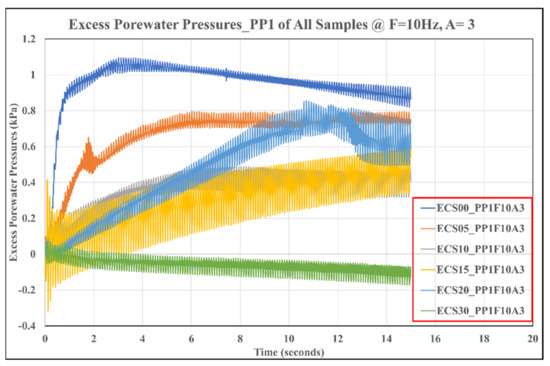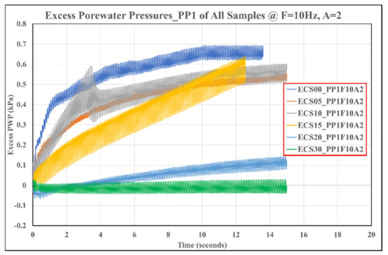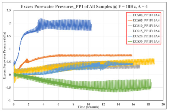 The observed excess PWP at the lower transducer (PP1) for the clean sand (i.e., ECS00) was the highest throughout the 3-stage shaking for all the studied soil specimens. Figure 8, Figure 9 and Figure 10 show the results of the evolution of excess dynamic PWP at the lower pore pressure transducer during the three shaking cycles for all the studied soil samples. From the graph legends, PP1 is the name of the pressure transducer installed at the lower end of the SB, F10 signifies the shaking frequency at 10 Hz, and A2, A3, and A4 represent the amplitudes of 2, 3, and 4, respectively. The confirmation of liquefaction in Equation (2) was executed by computing the excess pore pressure ratio , obtained by the ratio of the excess pore pressures to the total effective stresses .