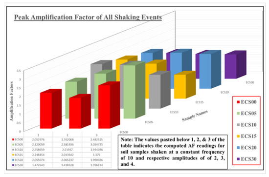 The soil dynamic amplification factor (AF) is defined as the ratio of the horizontal peak ground acceleration (PGA) at the ground surface to the PGA from the bedrock or the earthquake acceleration ratio at which the earthquake acceleration would reach the ground surface [19]. One of the key parameters for earthquake-resistant designs is the PGA. This parameter helps to correctly predict when the magnitude of acceleration change from a bedrock would reach the ground surface. The derived AF values of the studied soil samples herein were computed as the ratio of the PGA from the ground accelerometer (AC2) to the PGA of the base input accelerometer (AC1). The observed patterns of computed AF were complex. The results were plotted on a three-dimensional statistical bar chart plot in Figure 11 to clearly illustrate the studied soils’ amplification behavior.