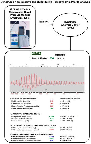 DynaPulse Noninvasive and Quantitative Hemodynamic Profile Analysis was used to pre-evaluate BP and cardiovascular hemodynamics [13,14] (Figure 2). The Pulse Dynamic noninvasive method was validated with catheterization at UCSD Medical Center Cath-Lab [14] and showed good agreement for noninvasive cardiovascular hemodynamics comparing to catheterization data. A Pulse Dynamic Noninvasive Blood Pressure Monitor (DynaPulse 200M), which can obtain BP readings and pulse waveforms, then transmitted the gathered information to the DynaPulse Analysis Center (DAC), via the Internet, for the immediate analysis of all Hemodynamic Profiles (Figure 2).