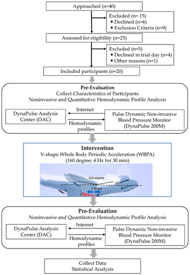 Based on the inclusion criteria and exclusion criteria, this study included 20 voluntary participants. All participants accepted the research terms and signed a consent form before the experiment. Pre-evaluation information, participants’ characteristics (age, body height, body weight, waist circumstance, hip circumstance, body mass index, and waist-hip ratio), and noninvasive and quantitative hemodynamic measurements were collected and taken. The intervention of WBPA-V-160 was performed with a moving distance, from headward to footward, of 2 mm, with 4 ± 0.1 Hz 0–0.8 G periodic motion for 30 min. A post-evaluation, taking noninvasive and quantitative hemodynamic measurements, was performed 5 min after the WBPA-V-160 intervention. The CONSORT flow chart for this study is shown in Figure 3.