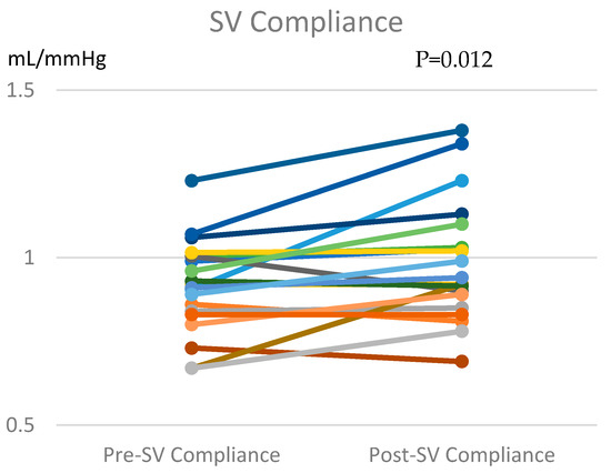 The systemic vascular (SV) compliance at post-evaluation (0.98 ± 0.18 mL/mmHg) was significantly higher than at pre-evaluation (0.91 ± 0.140) (Table 3). The data of SV compliance at pre-evaluation versus post-evaluation are shown in Figure 6. There was no difference between pre- and post-systemic vascular (SV) resistance (Table 3).