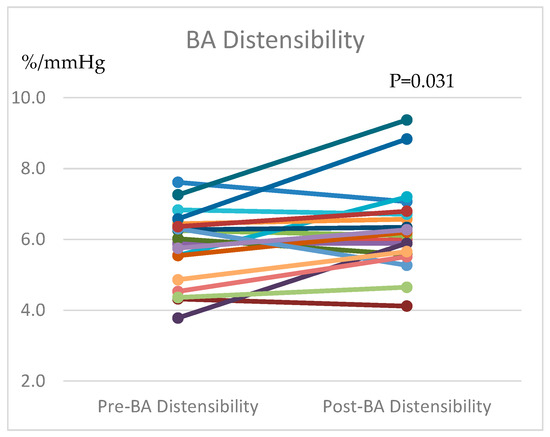 The pre-BA distensibility and post-BA distensibility of the individual brachial artery (BA) distensibility. p < 0.05 means significant increases in BA distensibility after 30 min of WBPA-V-160.