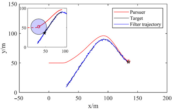In the test, the evader always moves at a heading angle of 10°. The pursuer senses the target and executes an interception in order to show the trajectories of the evader and the pursuer more clearly.