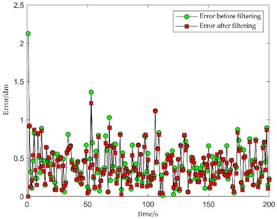 The observation trajectory obtained by the observation station is obviously oscillating, but the observation noise value of the observer is relatively small, so it is closer to the value of the real trajectory. This measurement value can be directly used for target-locking and interception in the simulation. However, since the actual observer may have abnormal values, it is necessary to determine and discard abnormal values. The position errors before and after filtering are shown in