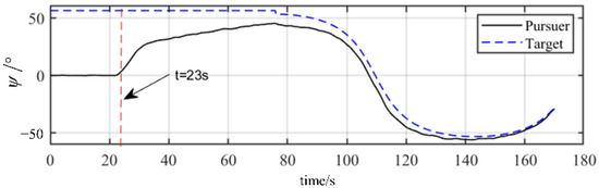 Figure 5 shows the angle changes in the pursuer and evader. When the evader enters the perceptual range of the pursuer around t = 23 s, the pursuer adjusts the motion angle to intercept the target.