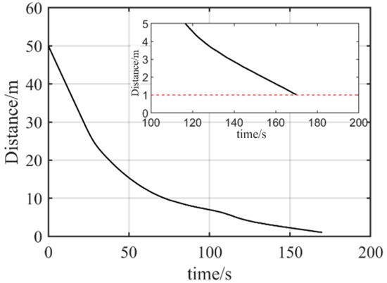 Figure 6, it can be seen that in the process of performing the pursuit, although the evader adopts a variety of motion modes, such as linear motion and curve motion, the pursuer always maintains a good tracking effect. It can be seen that in about 150 s, the distance between the pursuer and the escaping target is less than 1 m. This is enough to ensure successful interception of the escaping target by the pursuit USV.