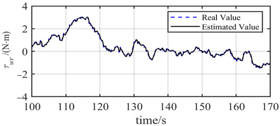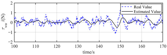 In order to test the estimation effect of the disturbance observer on the uncertainty of the system, the actual value of the total disturbance momentum of the system in this simulation is compared with the estimated value. Because the USV belongs to the underactuated control system, only the designed thrust disturbance and rudder force disturbance are compared. The observation results of system disturbance are shown in