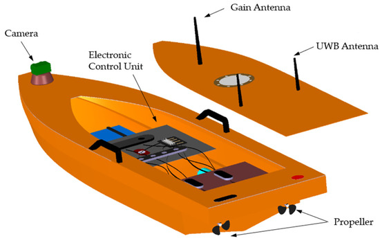 In order to further validate the effectiveness of the interception algorithm proposed in this paper, the pursuit-evasion experiment ispresented in this section. Two USVs with the same principal dimensions are defined as the evader (yellow) and the pursuer (orange). The mass of the USV is 12 kg, the length is 0.8 m, and the width is 0.24 m. The maximum speed of the evader and the pursuer are 0.5 m/s and 0.6 m/s, respectively. The position is measured by the ultra-wideband (UWB), and the positioning accuracy is 0.1 m. In addition, the pursuer is equipped with cameras to hunt the evader. The composition of the USV is shown in