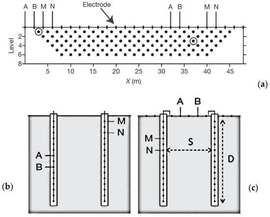 - Zhou, B.; Greenhalgh, S.A. A synthetic study on cross-hole resistivity imaging with different electrode arrays. Explor. Geophys. 1997, 28, 1–5. [Google Scholar]