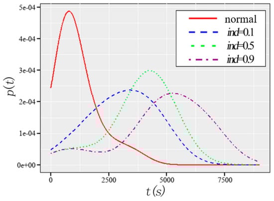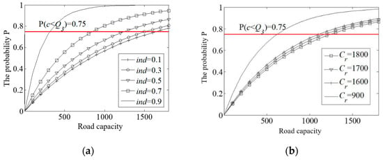 The traffic Q3 values of sections with different traffic capacity after the earthquake are given in Formula (14). At the same time, the road capacity is analyzed, respectively, from the normal and post-earthquake conditions. The results of the above two examples show that the exponential distribution model is reasonable. According to Figure 3a, when the earthquake damage index increases, the road capacity gradually decreases. According to Figure 3b, under the same earthquake damage index, the greater the basic road capacity of a road, the higher the road capacity is.