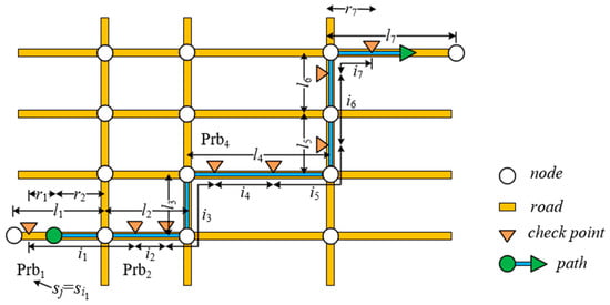 Section path is defined as an acyclic directed path π = (ks, k′, …, k′′, ke), and os is defined as the distance from the starting point of the road section ks to the starting point of the route; oe is the distance from the start of the section ke to the end of the route. For a road section k, if the length covered by the path π on the road section k is ak, then: