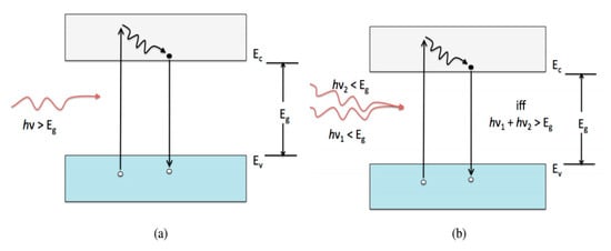 Mechanisms of SPA and TPA. ((a): single photon absorption, (b): two photon absorption).