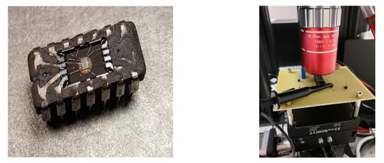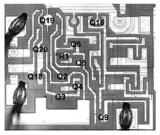 The typical operational amplifier LM124 of the TI company was selected as the device under test, and the single-event transient was induced by a pulse laser. Then, the different characteristics of SPA and TPA were compared and analyzed. Due to the limited penetration capacity of light, the device was capped before the test, as shown in Figure 3. The device was configured for V = 1 V and V = ±15 V.