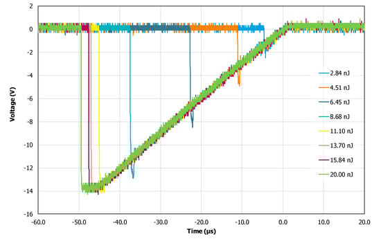 The transient voltage induced by the TPA technology under a 1260 nm light incidence of the sensitive region Q20 varied with the laser energy, as shown in Figure 8, below.