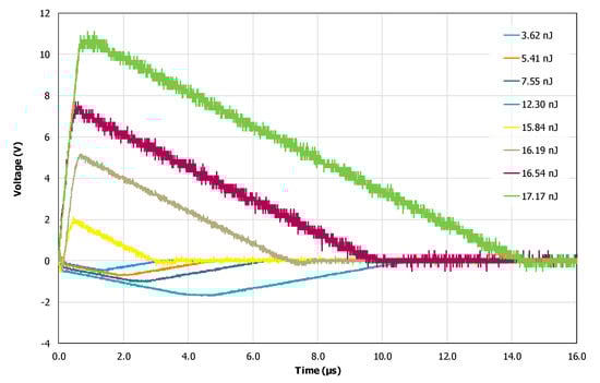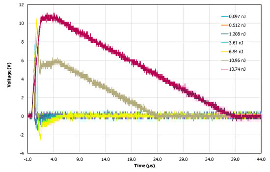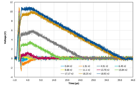 As can be seen from Figure 9, when the pulse laser energy was low, the transient voltage firstly appeared as a positive polarity pulse, followed by a small negative polarity pulse, and this situation continued until the pulse laser energy was about 6.45 nJ. Then, with the increasing pulse laser energy, the transient voltage pulse presented as a positive pulse with a larger amplitude, followed by a positive pulse with a smaller amplitude. When the pulse laser energy was greater than 18 nJ, the transient voltage pulse appeared as a positive pulse, and its duration increased with the increasing laser energy.