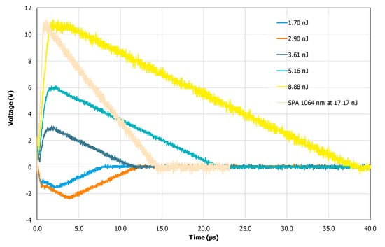 As can be seen from Figure 7, when the laser energy was 3.62 nJ, a negative transient voltage was observed, with an amplitude of about −1.8 V. When the laser energy was 15.84 nJ, a positive transient voltage was observed, and the amplitude of the transient voltage increased with the increasing laser energy.
