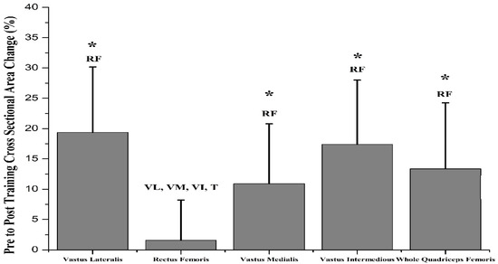 Leg press (pre: 258.6 ± 53.7 kg, post: 355.9 ± 57.1 kg) and half-squat (pre: 149.5 ± 28.7 kg, post: 191.8 ± 25.4 kg) 1-RM were significantly increased after training (p < 0.001). The T CSA was significantly increased after the training intervention (pre: 63.4 ± 12.8 cm2; post: 72.4 ± 18.1 cm2; p < 0.001). Considering the four heads of quadriceps, significant increases were observed for CSAs of VL (pre: 18.3 ± 3.6 cm2; post: 22.3 ± 5.4 cm2; p < 0.001), VM (pre: 11.1 ± 3.5 cm2; post: 12.1 ± 3.8 cm2; p = 0.037) and VI (pre: 23.7 ± 5.1 cm2; post: 27.8 ± 6.0 cm2; p < 0.001). No significant changes were observed between pre- and post-training values for RF CSAs (p = 0.485). Significant deferences were observed between the percentage changes in RF CSA and that of VM, VM, VI and T (p < 0.05; Figure 1).