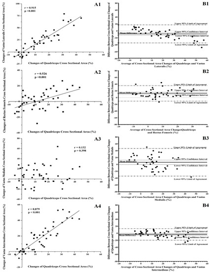 A strong aspect of the present study was that it employes all of the needed statistical analyses as well as an absolute agreement analysis between the percentage training-induced changes in CSA of T versus those of VL, RF, VM and VI. Until now, the majority of the studies investigating which of the four heads of quadriceps is the best surrogate for T quadriceps used only the Pearson-r correlation coefficient and/or the ICC coefficient [8,11,30,31]. However, using Pearson-r correlation coefficient and/or the ICC coefficient could not provide sufficient evidence about the accuracy and reliability in such type of studies [36,37,38,39,40,41,42]. Thus, further statistical analysis was needed, such as SEM, CV, mean of the differences, Bland-Altman plots, LOA, SEL and RC, to provide readers and professionals details regarding the accuracy as well as the extent of the existing error between the mesaurements [36,37,38,39,40,41,42]. According to the results of these analyses, in the present study, all of the established criteria for high accuracy, reliability, repeatability and reproductivelity have been met for the ultrasonographic evaluation of VL’s and VI’s CSAs’ training-induced increases, as potent surrogates of whole quadriceps muscle hypertrophy. Contrariwise, very low values were observed for VM and especially for RF. Specifically the training-induced change in RF hypertrophy were significantly different from those observed either in the other three heads of quadriceps, but mostly of the whole quadriceps hypertrophy. Significant inhomogeneous hypertrophy between the four heads of quadriceps has been previously reported, with significant hypertrophy to observed in whole quadriceps muscle, and specifically in VL, VI and VM, while no hypertrophy in RF was found after different types of multijoint lower body exercise [18,19], such as those adopted in the present study. However, the highest hypertrophy in RF compared to the other three quadriceps heads has been reported only after resistance training with leg extension [32,43,44,45,46]. Thus, it could be suggested that the results of the present study may be more accurate when lower-body multijoint exercises were adapted during the resistance training program. The results of the present study should be tested in future studies, adopting single-joint lower-body exercises.
