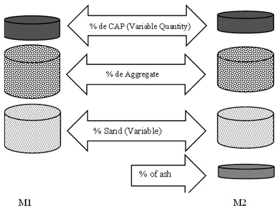 A study of asphalt mixtures with coke boiler ash as filler was carried out for different mixtures by the binder content (CAP 30/45), with 4.0% plus 0.5% until reaching a content of 6.0% CAP. This procedure was carried out for the two main types of mixture, with and without ash, both made by the Marshall dosing method (M1 and M2) whose models are represented in Figure 2. As for the aggregates, their temperatures were taken as 10 °C above the temperatures of the binders. The diameters and heights of the Marschall tests consists of an optimal content being 10 cm × 6 cm (amount of 50), a stability of 10 cm × 6 cm (6), a modulus of resilience (at 25 °C) of 10 cm × 6 cm (15), an indirect tensile strength (at 25 °C) of 10 cm × 6 cm (9) and a fatigue life (TC) of about 10 cm × 6 cm (30), which results in a total of 110.