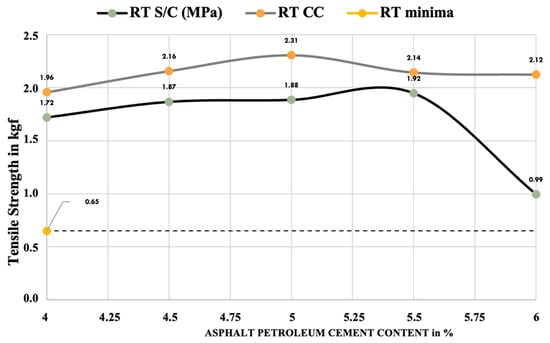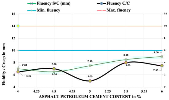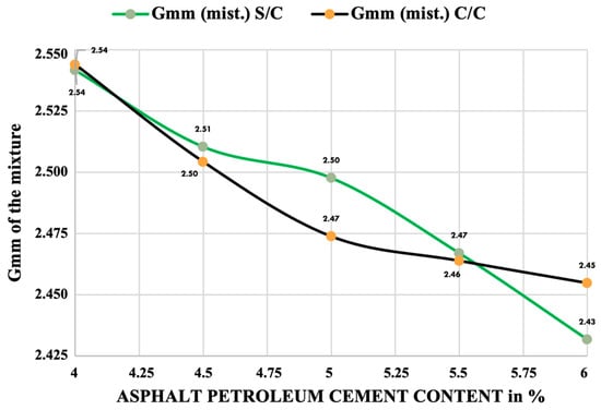 The dosage of an asphalt mixture is a formulation process in which a granulometry of aggregates with specific natures is sought together with the addition of CAP, so that after mixing at the appropriate temperature and subsequent compaction, they form a material that offers conditions for proper mechanics. This supports loads that demand a specific pavement, and whose material does not show premature deterioration when subjected to climatic and traffic variations []. This method considers a variety of characteristics, such as granulometry, bulk density of the mix, maximum theoretical density of the mix, percentage of voids of the compacted mix (Vv), percentage of voids of mineral aggregates (VAM), bitumen-void ratio (RBV), stability and fluidity (creep).
