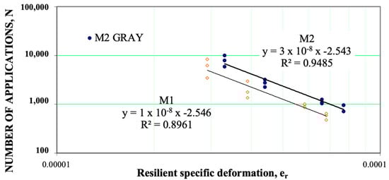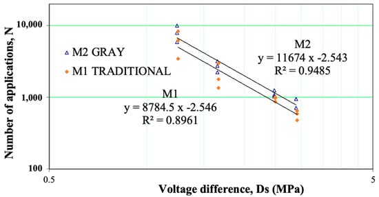 From these results, it was possible to plot specific deformation curves and stress differences as a function of the number of cycles required for failure (Nf), as illustrated in Figure 7 and Figure 8.