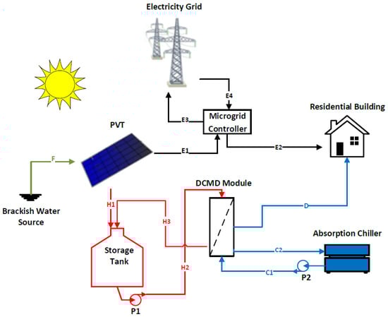 A photovoltaic/thermal hybrid (PVT) powered system is a reliable source of energy where heat and electricity can be generated simultaneously. The proposed hybrid system shown in Figure 1 comprises primarily of PVT, a direct contact membrane desalination unit (DCMD) for water purification, a small absorption chiller, and a typical residential unit. The heat generated from the PVT () is used to heat the working fluid (i.e., Brackish water). In this case, the brackish water is heated in PVT before it enters the DCMD unit. The storage tank is used to collect the heated water and auxiliary heating is utilized if the temperature in the tank drops below 70 °C to ensure a constant energy source for the DCMD. The heat rejected from DCMD () is used as a regenerative source for a small-scale absorption chiller. Cold feed water obtained from the absorption chiller () is pumped to DCMD.