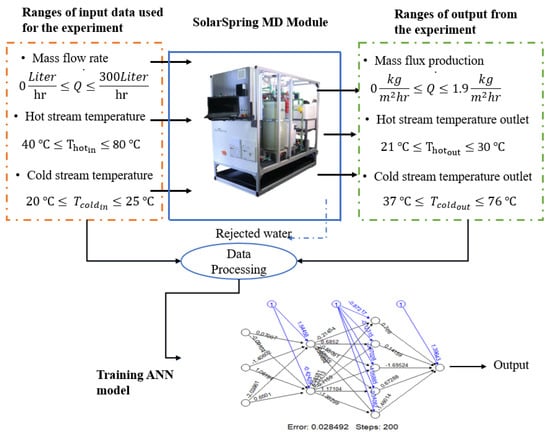 Inspired by the experimental and theoretical studies by previous works [25,26], a machine learning algorithm, namely, Artificial Neural Network is developed to estimate the performance of the DCMD. The experimental dataset used to train the ANN model was illustrated in a previous study [26]. The developed DCMD’s ANN model is shown in Figure 2. The input dataset was normalized to a range of (0,1). Then, the input parameters were divided into two parts: where 70% of data was used to train the ANN model, while 20% was utilized for testing. The ANN model of the DCMD was developed using R software [27]. The developed ANN model is valid to forecast the outputs, which are the hot and cold stream temperature and the water productivity, within the data ranges shown in Figure 2.
