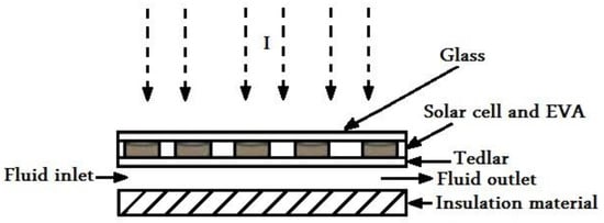 The type of PVT considered here is a flat-plate collector. A cross-section area of a typical flat-plate collector is shown in Figure 3, where I indicates the solar radiation falling on the collector’s surface.