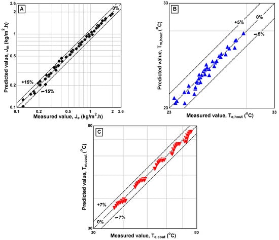 Mathematical model for the used DCMD device was validated using experimental data reported in the literature [26]. Figure 4 shows the results of the developed model against the experimental data. Generally, the model showed a good agreement with the experimental results. The model-predicted under various operating conditions for the permeate mass flux, the hot water temperature outlet, and the cold-water temperature outlet were within ±15, ±5, and ±7 division bands, respectively. The origin of deviations might be attributed to two reasons: (i) the variability of the experimental results, and (ii) the model’s assumptions.