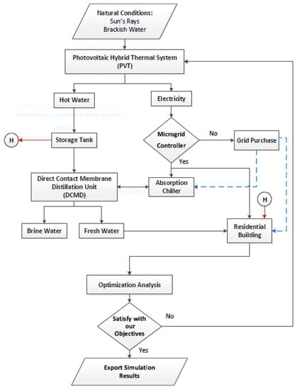 The proposed hybrid system was evaluated using typical Riyadh, Saudi Arabia weather conditions. Figure 5 depicts in detail the solution procedures utilized in this study. The first step in the simulation is to estimate the hourly electricity and hot water production from the PVT. In this case, the electricity production obtained from the PVT is dispatched to the house for immediate use or sold to the grid if the electricity production is more than house electric demand. The hot water stream is supplied from the storage tank to the DCMD unit, and the portable clean water is sent to residents. The rejected cold water comes from the DCMD is sent back to the chiller to be used for a regenerative purpose. The end goal of this simulation is to optimize the hybrid PVT size by minimizing the annual operating cost and maximizing water productivity. In this case, the proposed hybrid system was optimized using MATLAB built-in function gamultiobj to minimize the total operating cost expressed in Equation (15) and maximize the water yields from the DCMD.