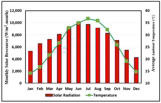 The performance of the proposed system was simulated based on a typical weather condition for the city of Riyadh, Saudi Arabia. The hourly variation of the solar radiation and ambient temperature is illustrated in Figure 6. There are wide variations of the ambient temperature and solar radiation during months. It is clear from this figure that the amount of solar radiation in the month of July in the city of Riyadh is abundant. The maximum outdoor solar radiation reaches around 9000 W/. Because the hybrid system is powered by solar energy, and since the amount of solar energy for the selected city is rich, this figure reveals a sustainable opportunity for the proposed system presented in this study.