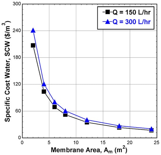 Effect of membrane area on Specific Cost Water (SCW) for different flow rates.